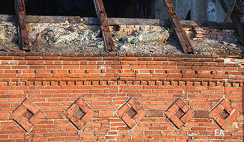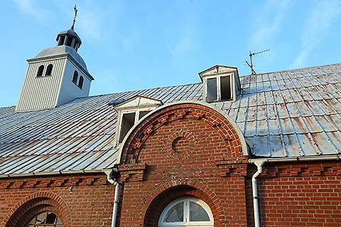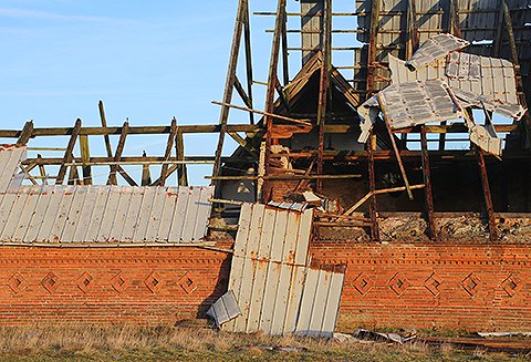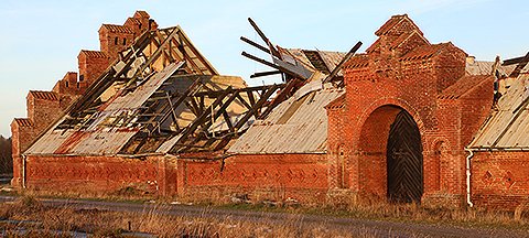 Ved nærmere eftersyn åbenbarer sig et mægtigt forfald - den prægtige, røde murstensbygning vakler under sin storhed. Murværk stadig nogenlunde ok, men resten i nærmest i frit fald.