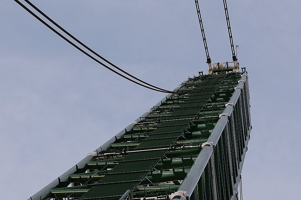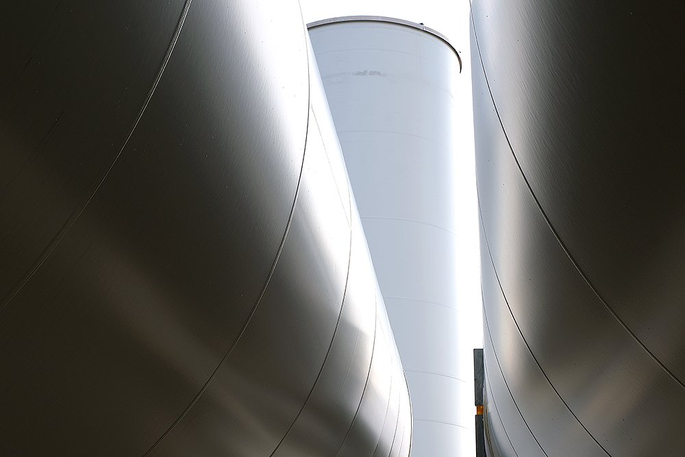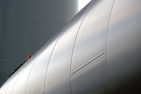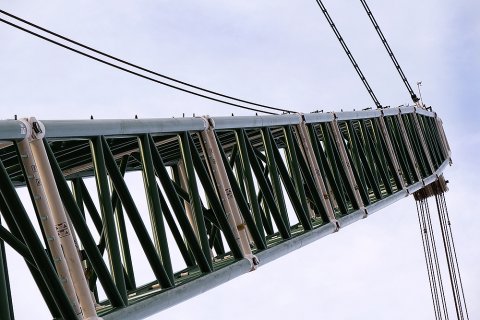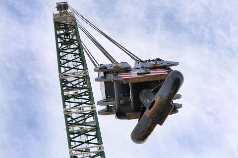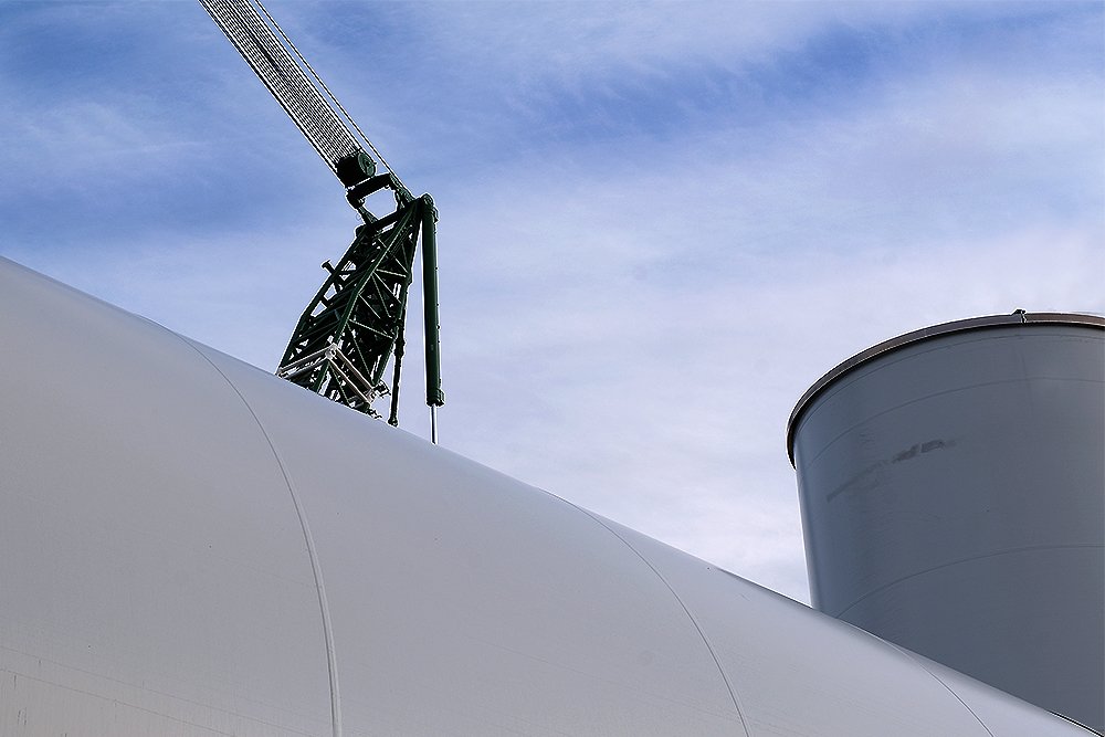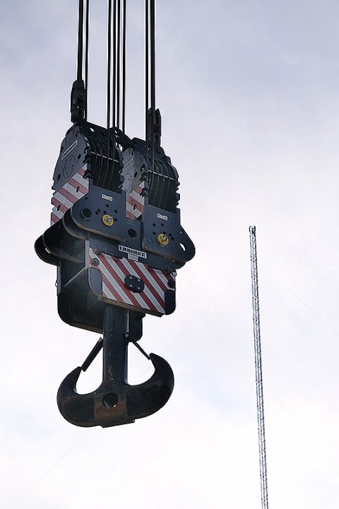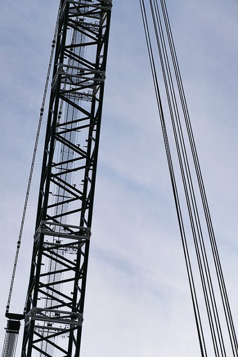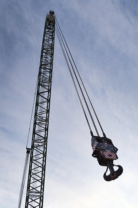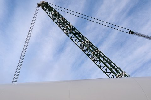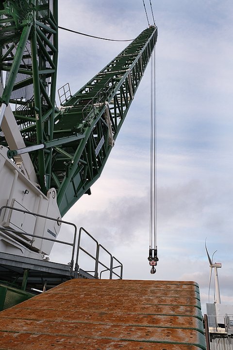 Den store kran til opsætning af den nyeste mølle virker - trods alle sine enorme muskler -  meget elegant og stilfuld